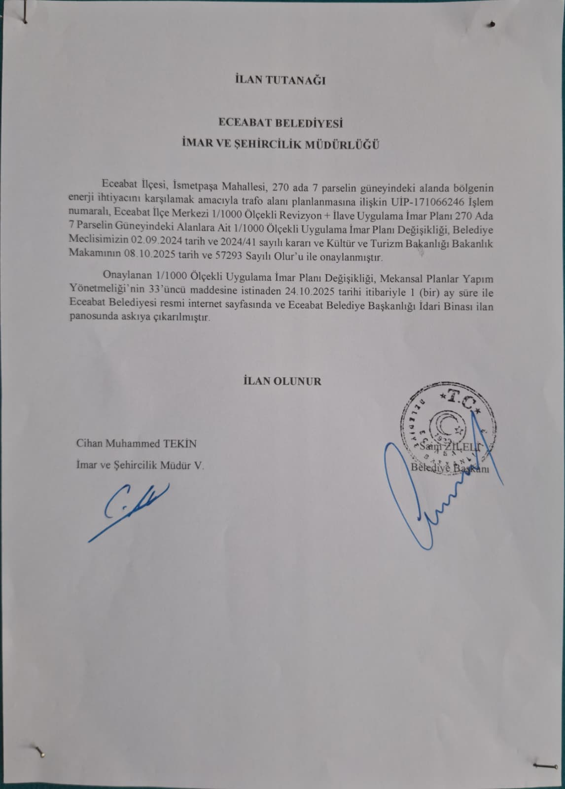 Eceabat İlçesi İsmetpaşa Mahallesi, 270 ada 7 parselin güneyindeki alanda bölgenin enerji ihtiyacını karşılamak amacıyla trafo alanı planlanmasına ilişkin UİP-171066246 İşlem numaralı, Eceabat ilçe merkezi 1/1000 Ölçekli Revizyon + ilave Uygulama imar Planı 270 Ada 7 Parselin Güneyindeki alanlara Ait 1/1000 Ölçekli Uygulama İmar Planı Değişikliği